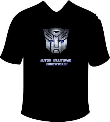 Seoses peatse pidupäevaga milleks ilma kahtlusteta on Transformers: Revenge of the Fallen´i jõudmine kinodesse, saab võimalikuks soetada endale uhiuus Trash Can Dance´i blogi T-särk. Tegu saab olema limiteeritud tiraažiga, ehk tellimusi võtan vastu vaid nädala jooksul alates 5. juunist ja lõpetades kui 13. kuupäeva kalendris ette lööb, hilisemaid pretensioone EI rahuldata. Tellimise aeg on küll limiteeritud nädalale, kuid see-eest avaneb suurepärane võimalus tellida särk just selles suuruses mis sulle sobib alates päkapiku omast ja lõpetades hiiglaskasvuga, kõik S-id, X-id ja M-id, lisaks naistelõikega, lastelõikega ja slim gayfashion tüüpi.Kellel huvi võib saata maili aadressile gtm242(ätt)hot.ee ühes enda poolt välja valitud suurusega või võtta minuga ühendust teisi kanaleid pidi. Särgihind käsimüügist 135.- krooni, postiteel tähitud pakiga Eesti piires lisandub postikulu 40.- krooni ( kokku 175.-) ja Euroopasse saates 60.- (kokku 195.-) . Hind võib langeda, sest hetkel ei oma veel täpset infot maksumuse kohta, läbirääkimised trükkaliga on pooleli. Raha enne kui särgid olemas on ei küsi. Tellimuse trükiks annan sisse 13. juunil ja särgid saavad posti teel saadetud ning käes-kätte jagatud enne esilinastust mis toimub 24. juunil.